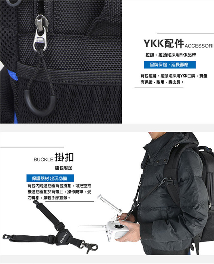 ■ 可把空拍機遙控器扣於背帶上,操作簡單