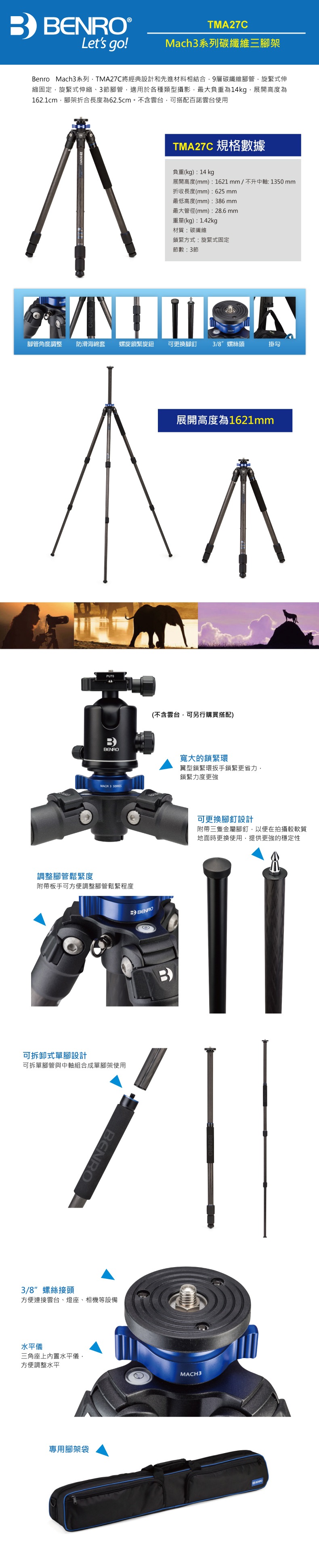Benro Mach3系列,TMA27C將經典設計和先進材料相結合,9層碳纖維腳管,旋緊式伸縮固定,旋緊式伸縮、3節腳管,適用於各種類型攝影,最大負重為14kg,展開高度為162.1cm,腳架折合長度為62.5cm。不含雲台,可搭配百諾雲台使用