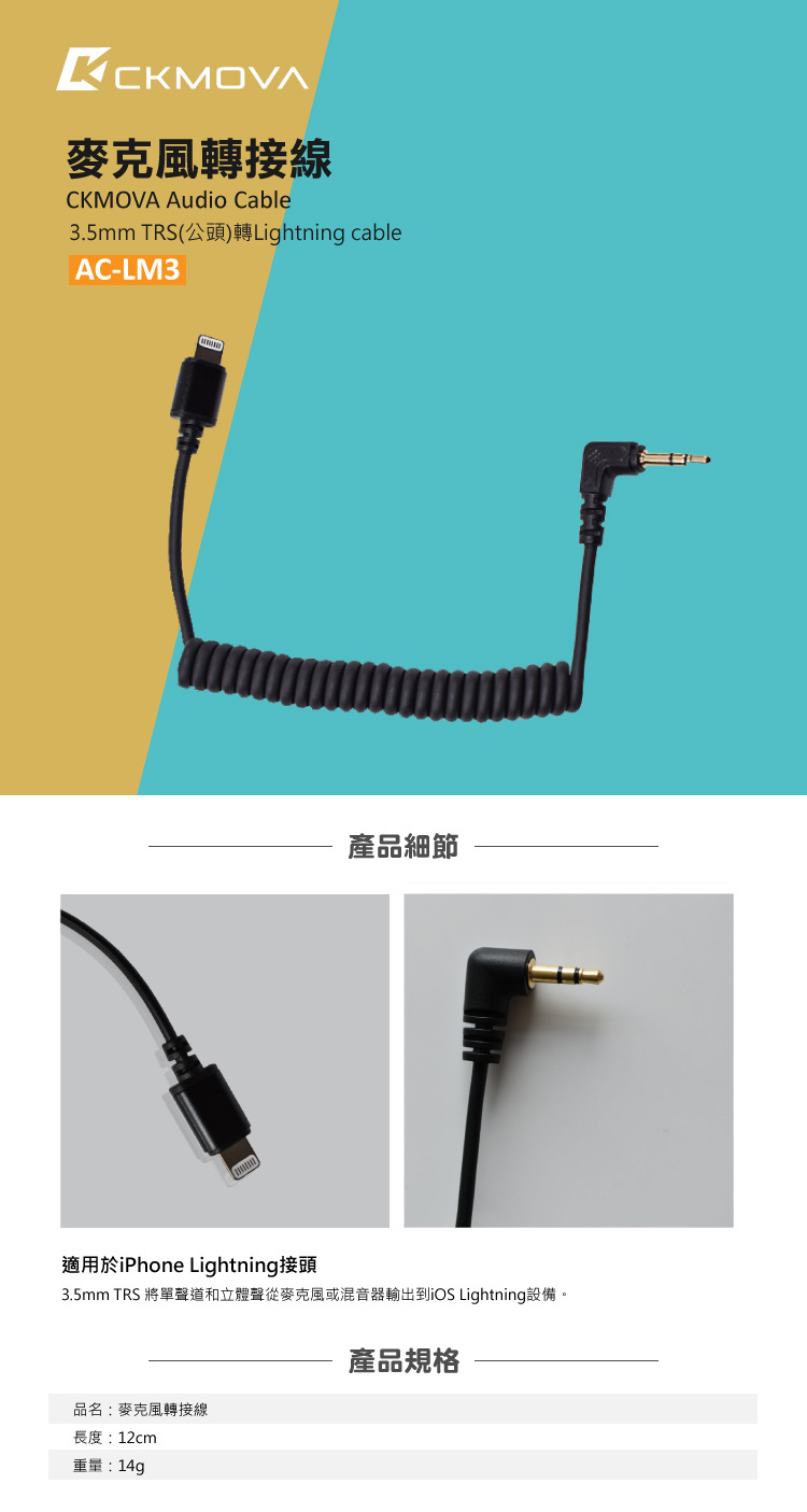 • 3.5mm TRS 將單聲道和立體聲從麥克風或混音器輸出到iOS Lightning設備