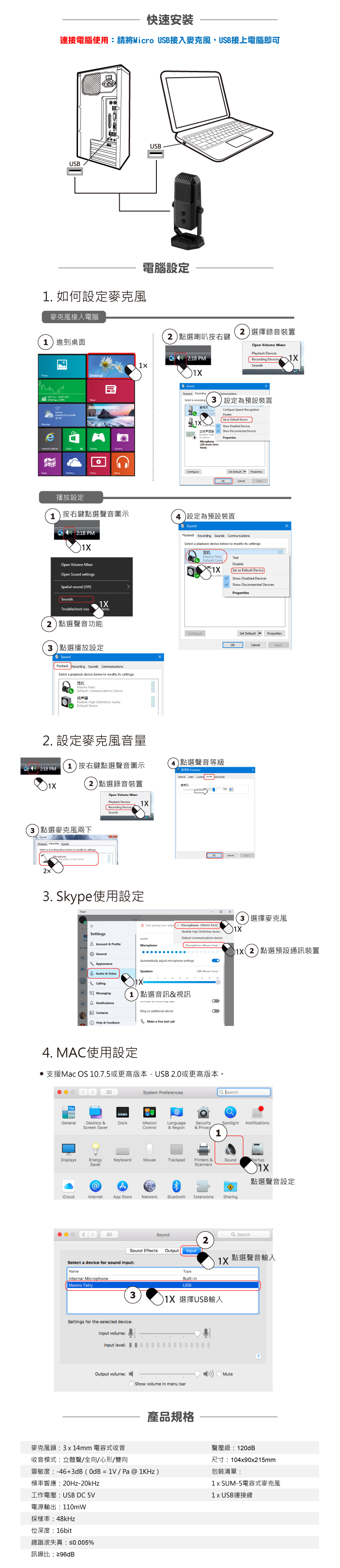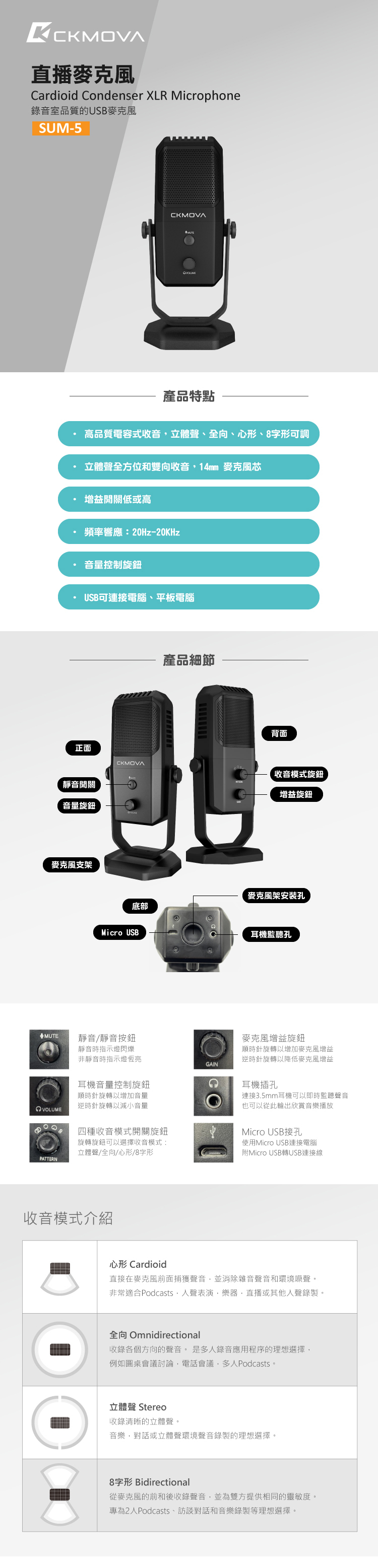 • 立體聲全方位和雙向收音,14mm 麥克風芯