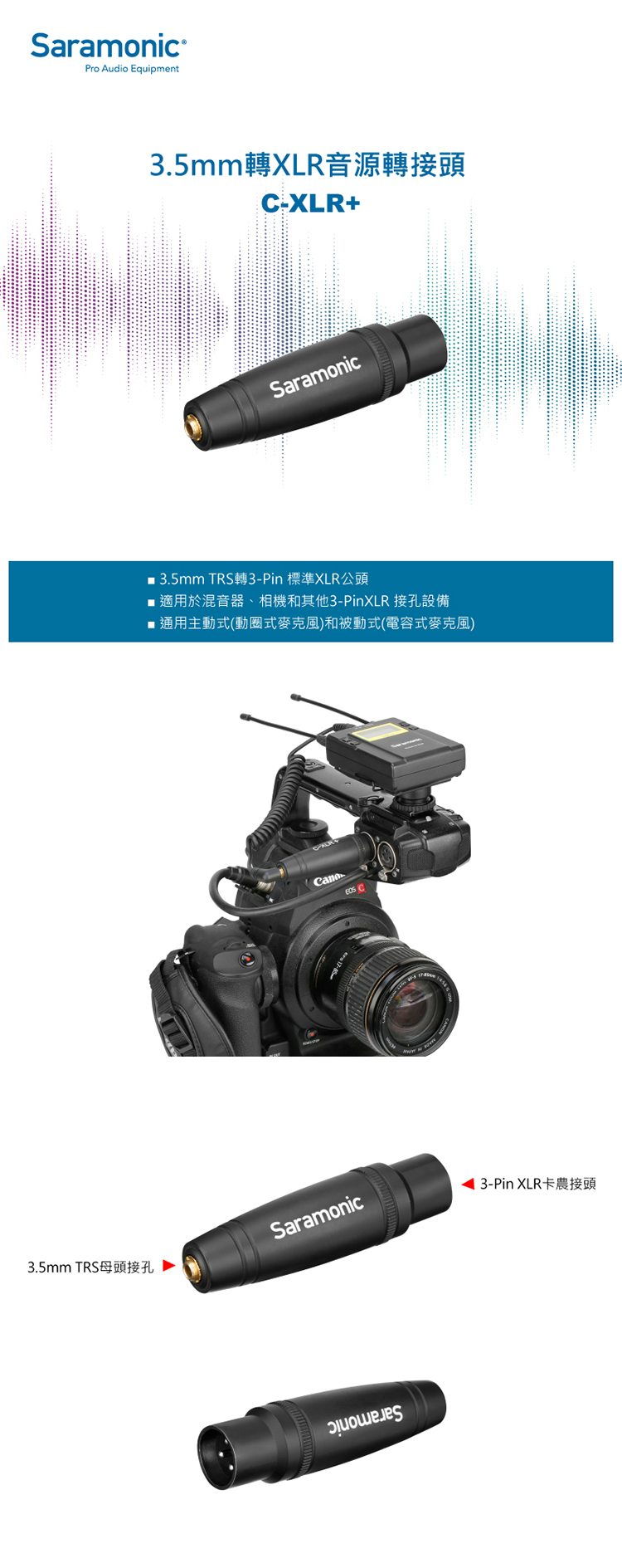 • 適用於混音器、相機和其他3-PinXLR 接孔設備