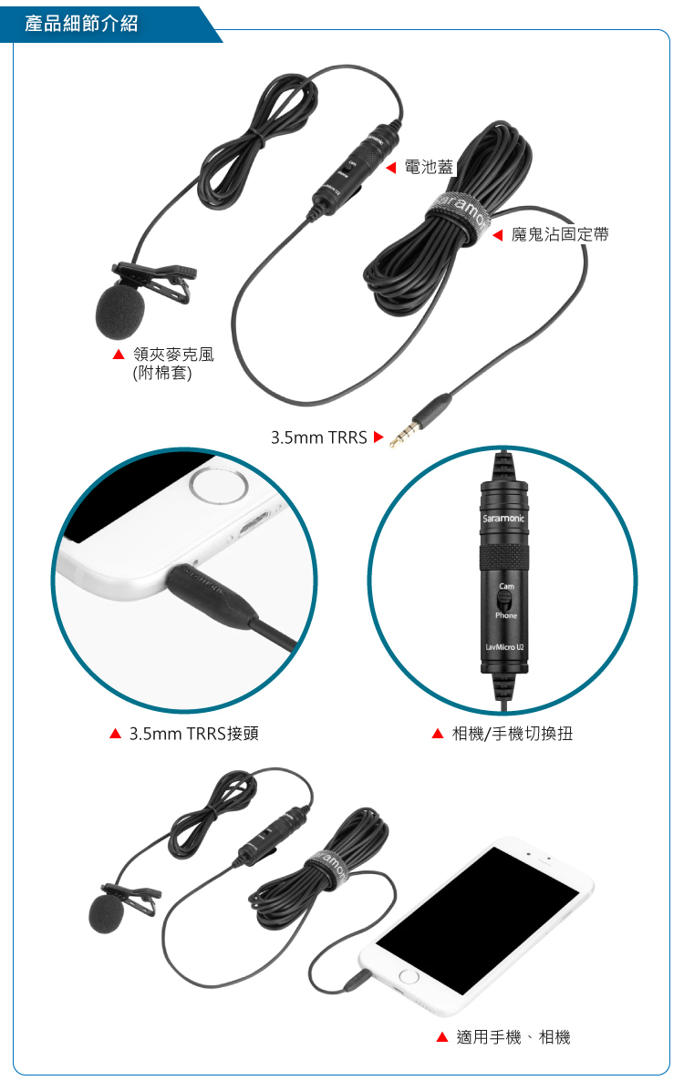 • 適用於相機,便攜式攝影機,智慧型手機、錄音筆等設備