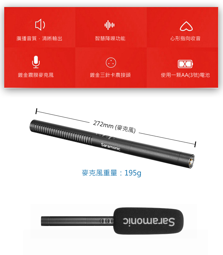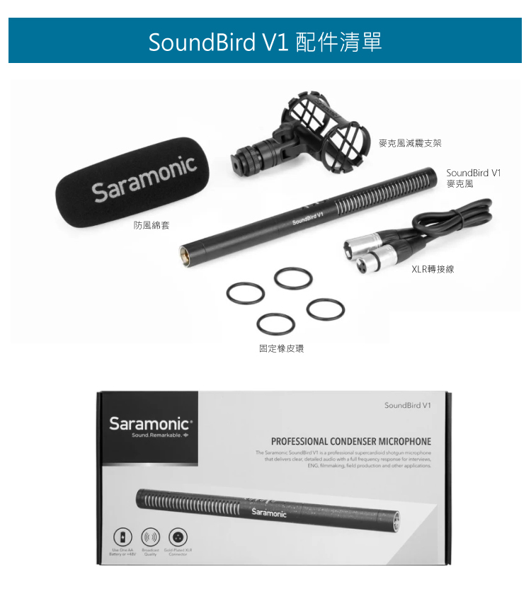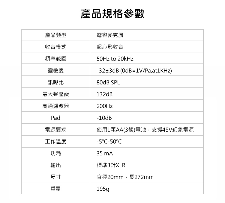 • 附防風綿套,麥克風夾和防震支架,XLR連接線