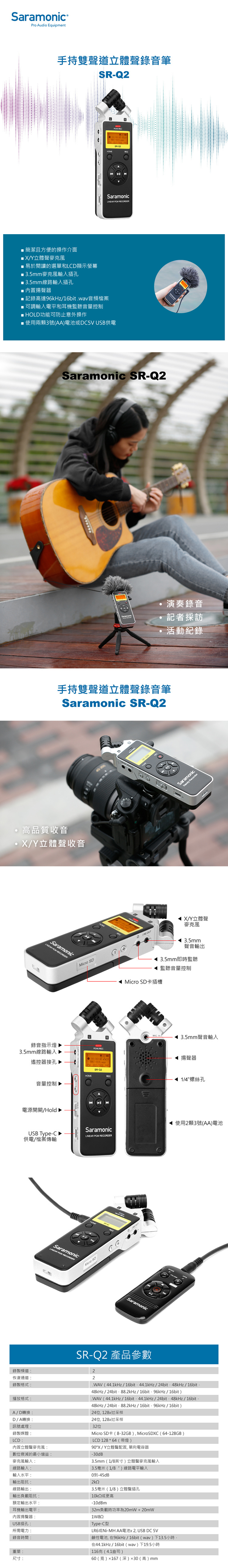 • 記錄高達96kHz/16bit .wav音頻檔案