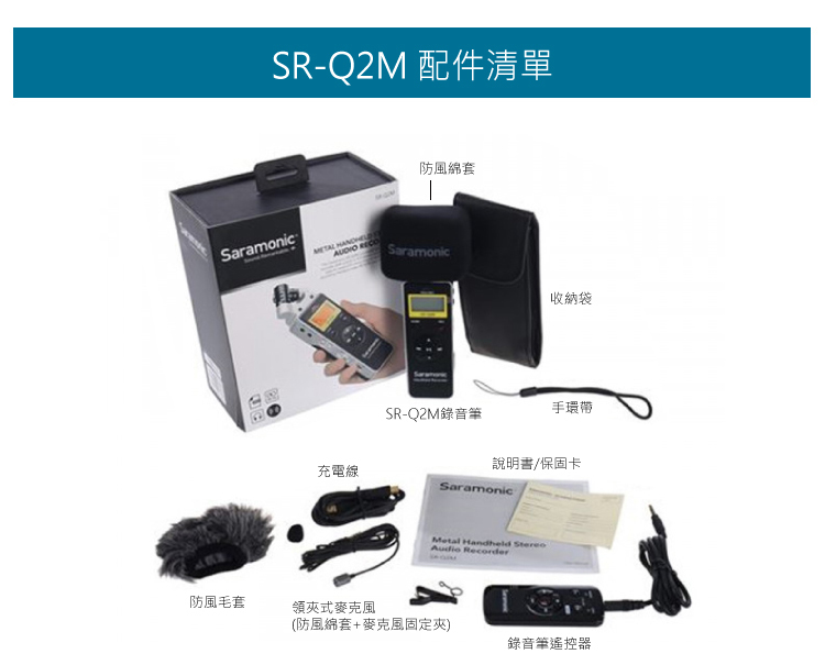 • 附防風綿套、防風毛套、手環帶、領夾麥克風(固定夾)、充電線、遙控器、收納袋