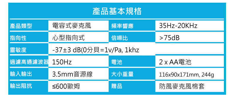 • 附防風麥克風棉套