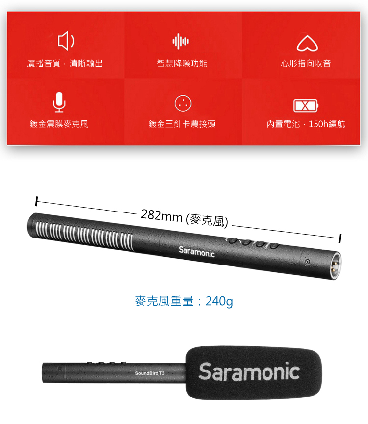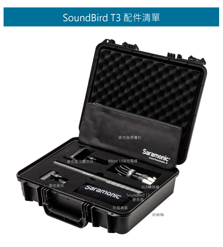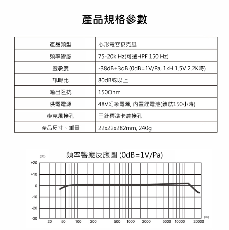 • 附防風綿套,麥克風夾和防震支架,XLR連接線和Micro USB充電線