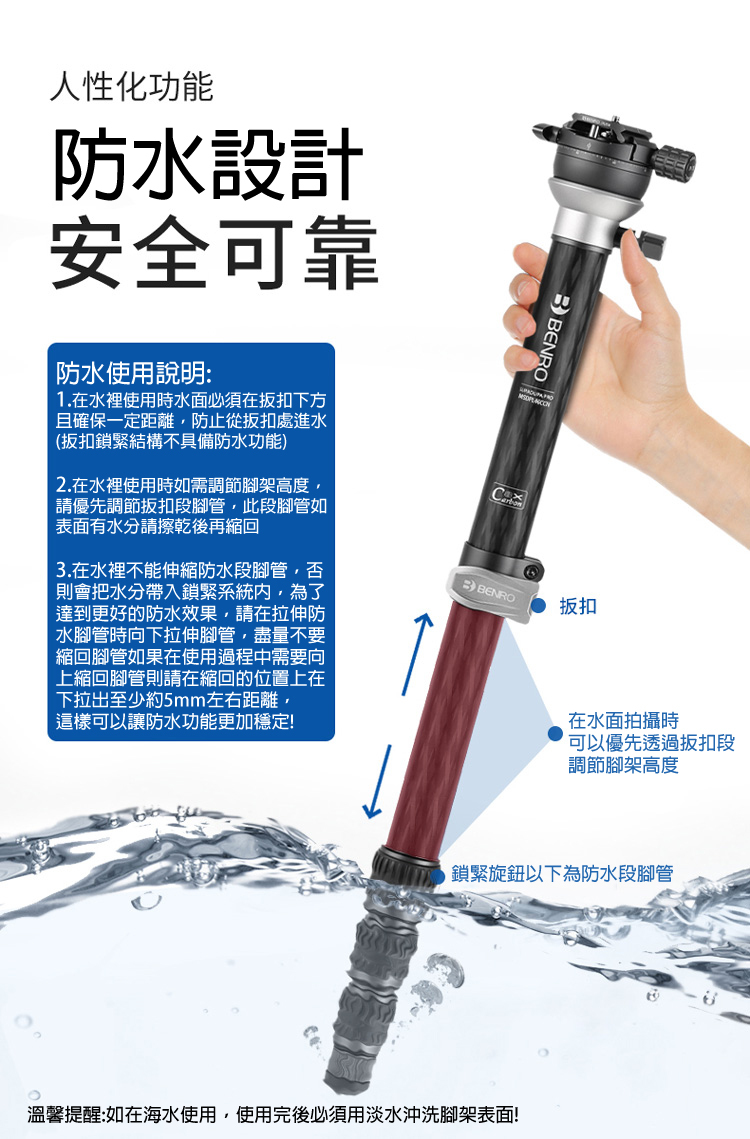 在水裡使用時,水面必須在扳扣下方且確保一定距離!