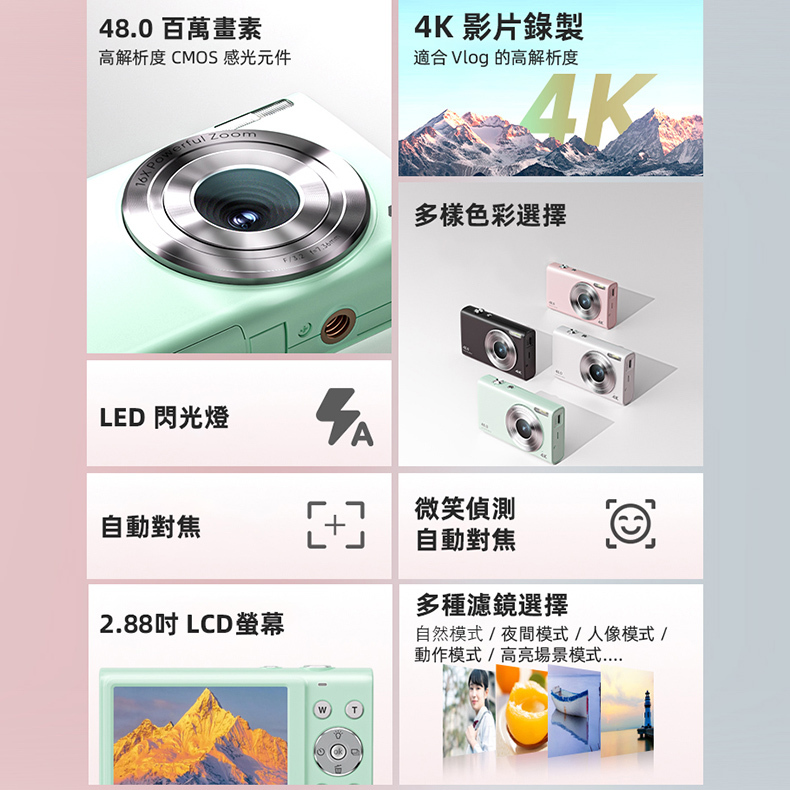 多種濾鏡,自動對焦